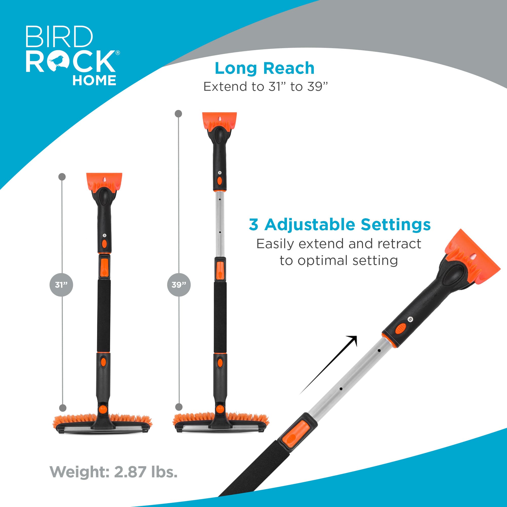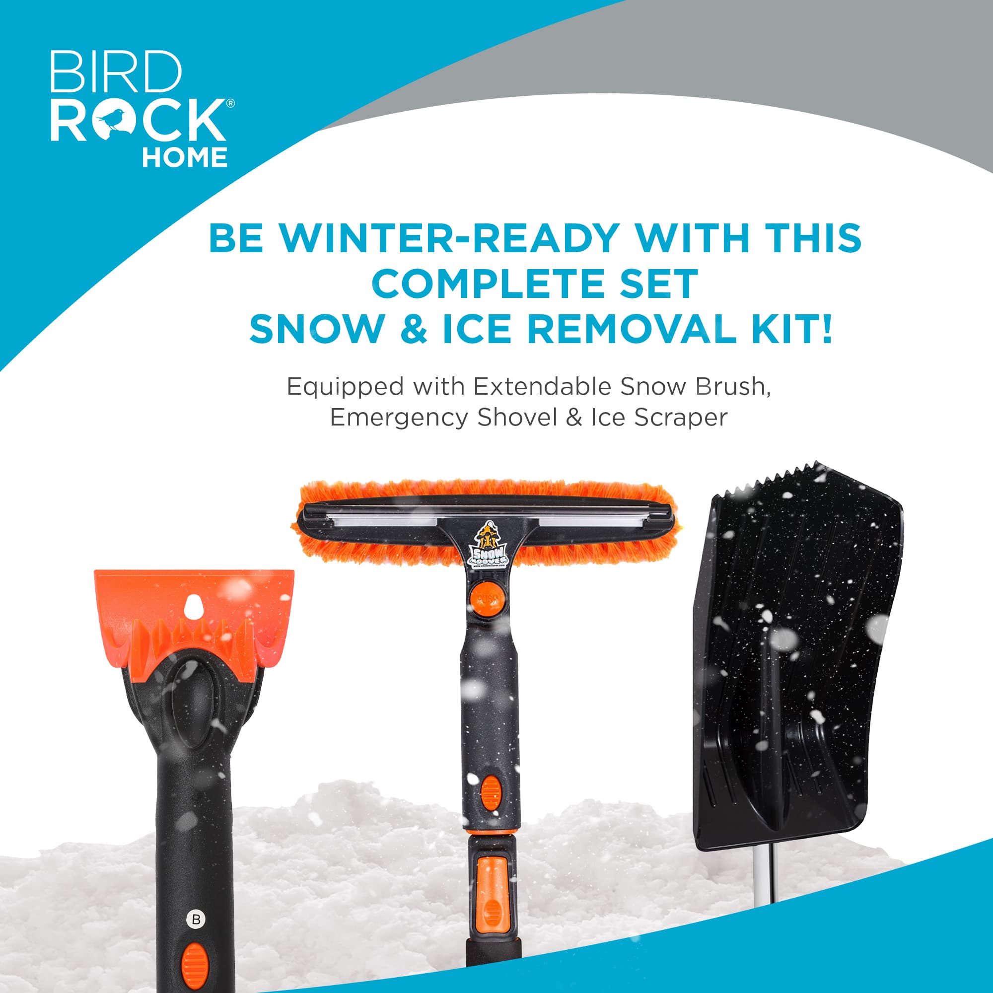 The Snow MOOver 39" Extendable Snow Brush, with Detachable Ice Scraper and Snow Shovel is your ultimate winter car care tool. Its 4-in-1 design includes a squeegee/bristle head, ice scraper, Snow Shovel and telescoping extender, ensuring efficient snow and ice removal. The brush extends up to 39 inches, ideal for cars, SUVs, and trucks, making hard-to-reach areas accessible. Or, interchange the parts to assemble your emergency snow shovel.