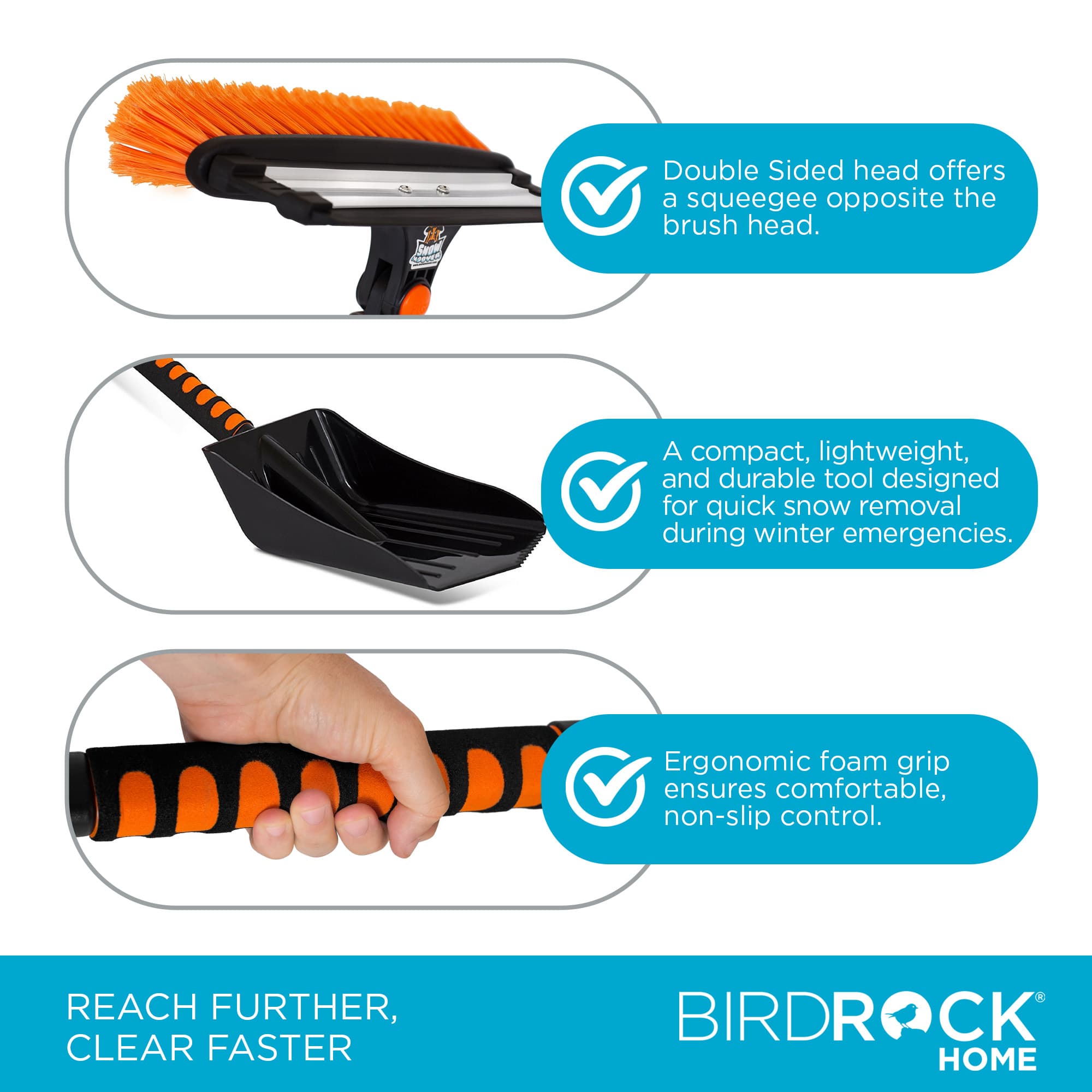 | Materials | Aluminum body, Squeegee/bristle head, Snow shovel, Foam grip |