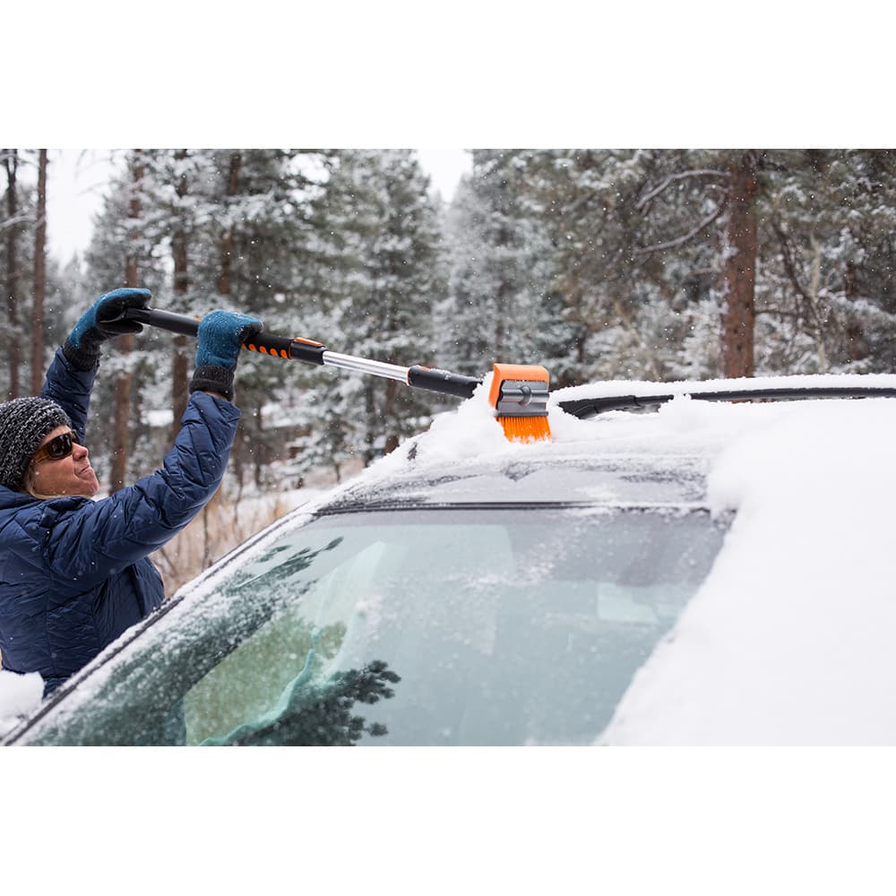 The Snow MOOver 60" Extendable Car Snow Brush and Ice Scraper is your essential tool for winter weather, designed to tackle tough snow and ice buildup on any vehicle. With a 60-inch extendable handle, this versatile brush reaches across windshields, roofs, and hoods of cars, trucks, SUVs, and RVs. Its dual-sided 13-inch head features a soft foam side for gentle snow clearing and durable bristles for tougher debris, ensuring a scratch-free clean.